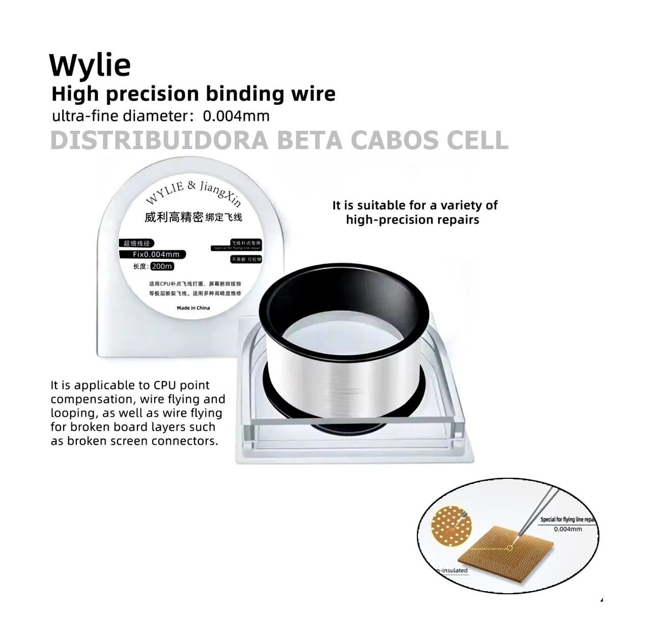 O Fio de jumper 0,004 mm 200 mts WYLIE 004H é um fio extremamente fino usado para fazer jumpers em eletrônica, ou seja, ligações elétricas entre pontos de uma placa de circuito ou protoboard quando você está montando, testando ou consertando um circuito.