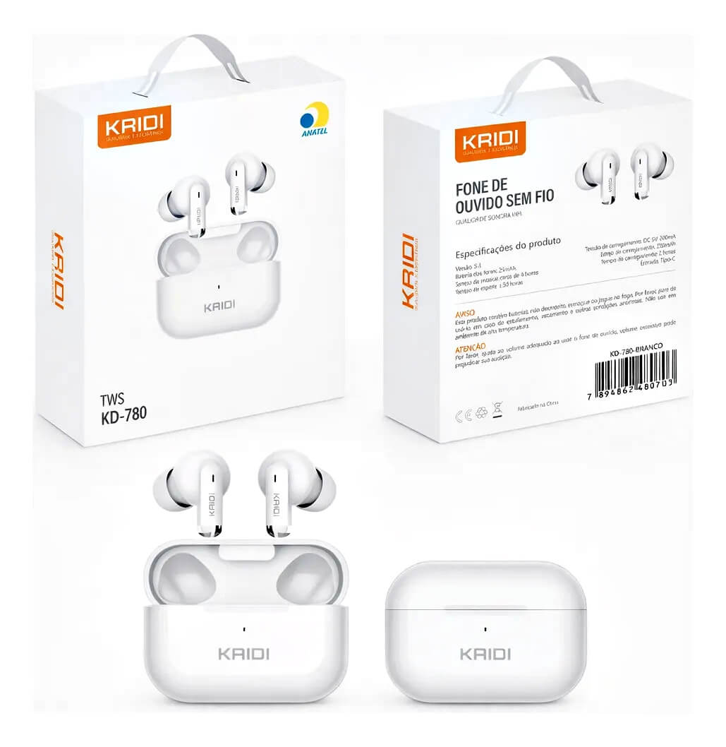 O Fone Bluetooth TWS Kaidi KD-780 é um fone de ouvido sem fio que conecta ao celular, tablet ou computador por Bluetooth, permitindo ouvir música e atender chamadas sem usar cabos. Ele usa tecnologia TWS (True Wireless Stereo), ou seja, os dois fones funcionam totalmente sem fios entre si.