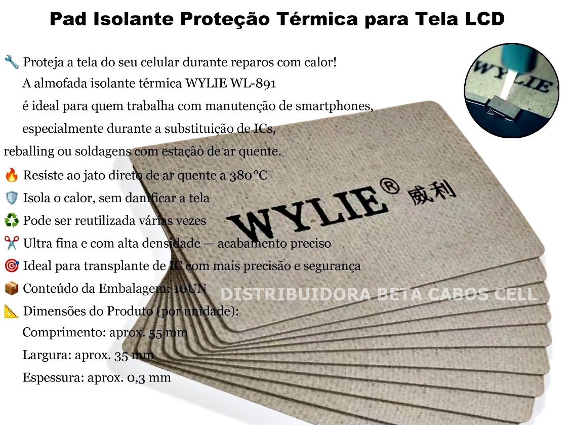 O PAD de Proteção Térmica 55×35×0,3 mm – 10 unidades (WYLIE WL-891) é um componente utilizado em eletrônica para proteger e isolar partes sensíveis de calor e choques térmicos durante soldagem ou uso de ferramentas de retrabalho.