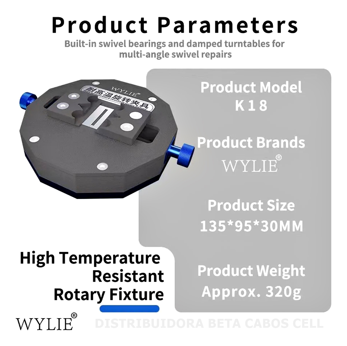 O Suporte Giratório para Placa e CI Universal WYLIE K18 é uma ferramenta usada em eletrônica para apoiar e girar placas de circuito ou componentes (CIs) de forma estável, facilitando reparos, soldagem, dessoldagem e inspeção.