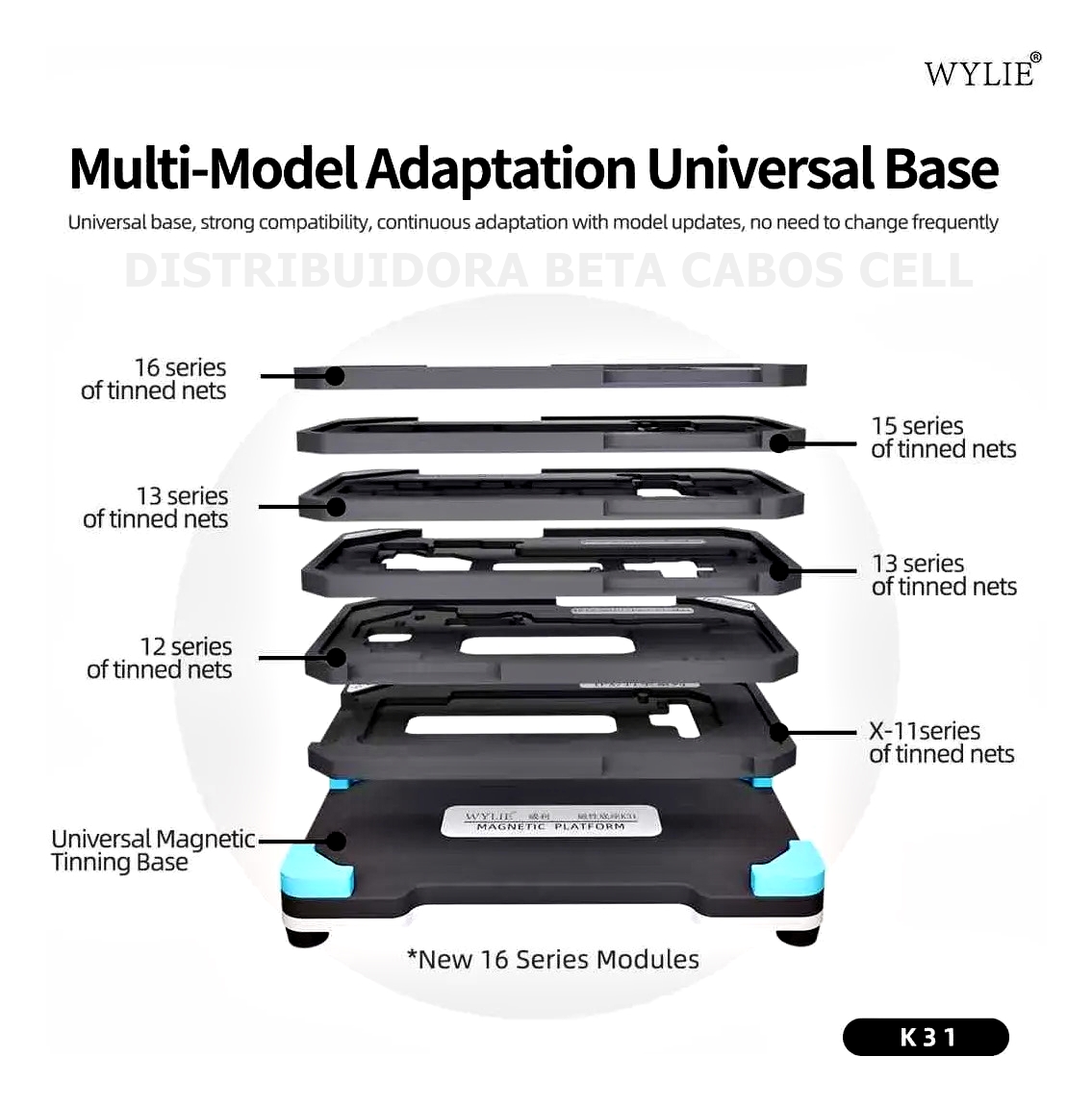 O Suporte Interposer iPhone X ao 16 Pro/Max Wylie WL K31 é uma ferramenta técnica usada em reparos de iPhones para conectar a placa lógica do aparelho a um equipamento de teste (como uma máquina de diagnóstico/teste de hardware) sem precisar soldar fios diretamente na placa.